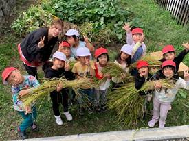 10月9日にはたわわに実った稲の稲刈りを行いました。この後に脱穀をして、野球ボールとすり鉢で籾摺りをして玄米にします。こども達はお米になるまでに如何に手が掛かっているのかを理解し、お米の大切さを